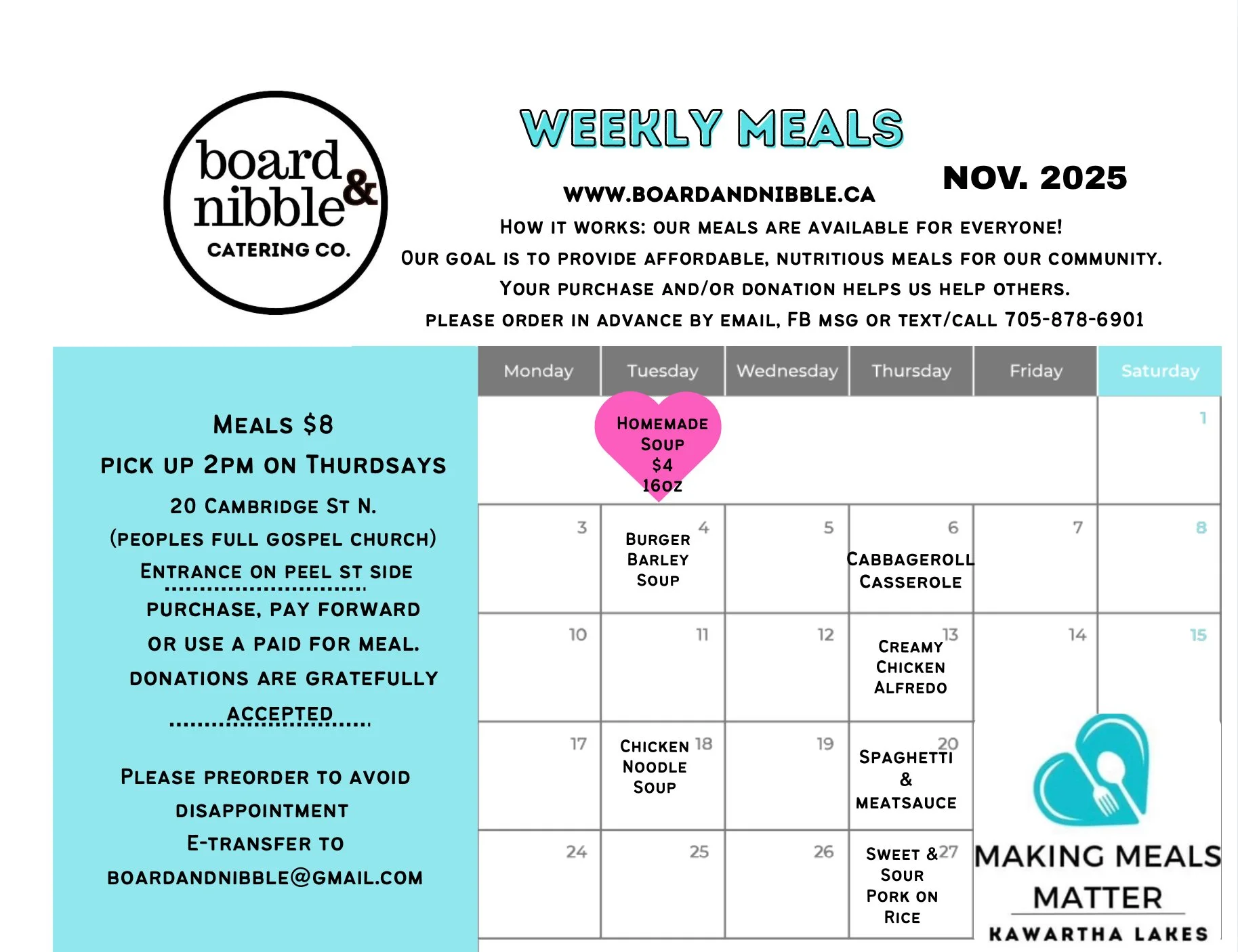 Our goal is to provoide an affordable meal a week to those who need it. We give the community an oppertunity each week to order for themselves if they would like a healthy homecooked meal. No money, no problem we are here to help the communiy in this way.